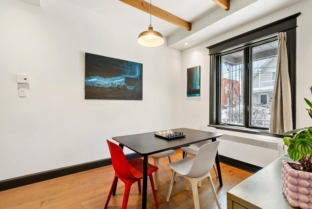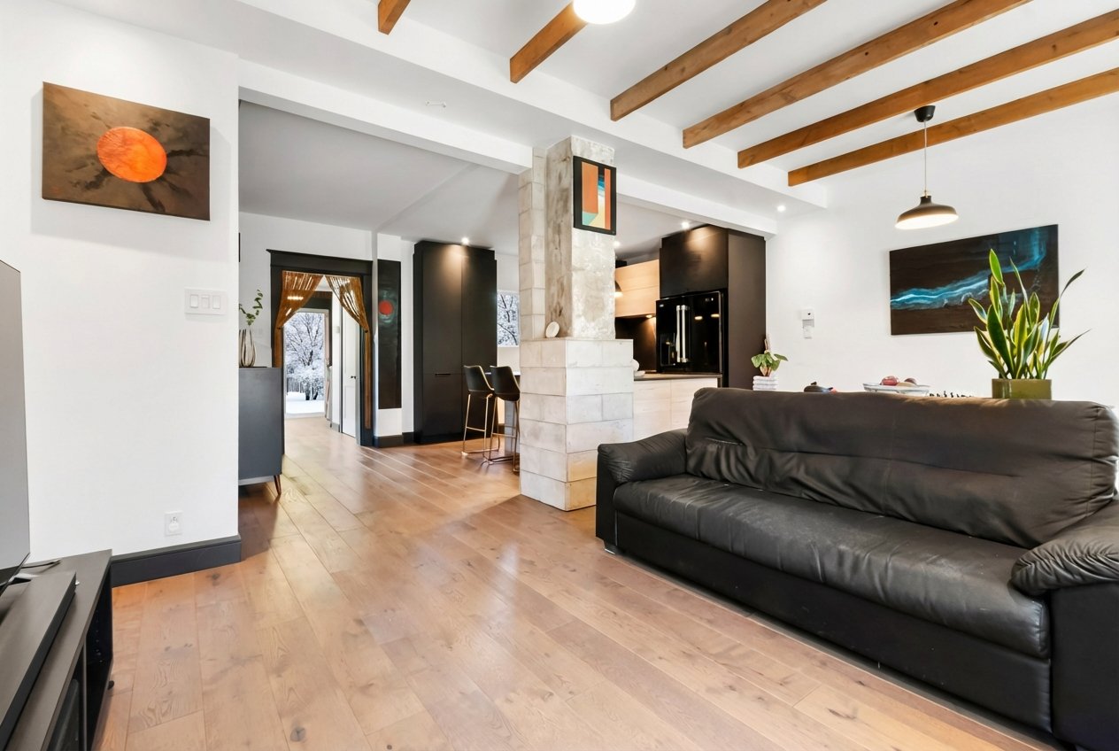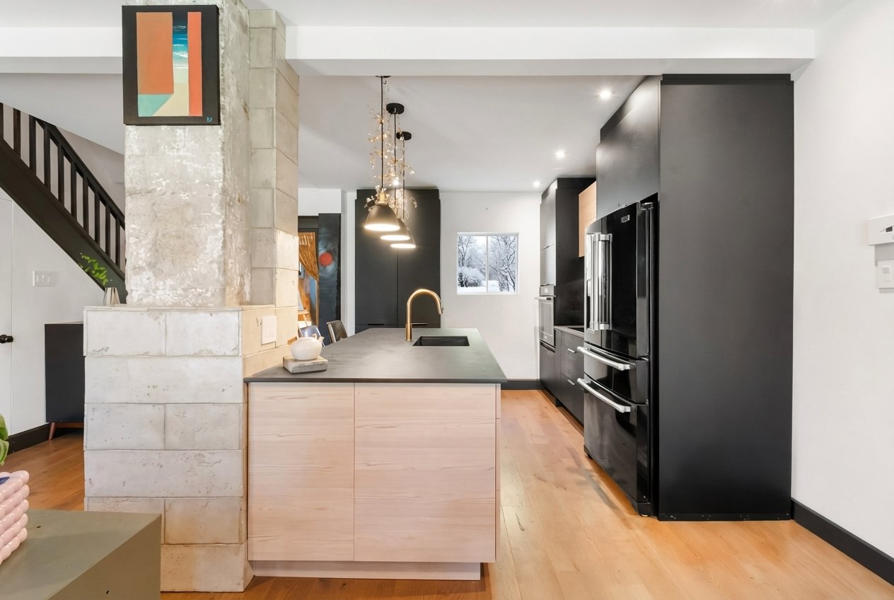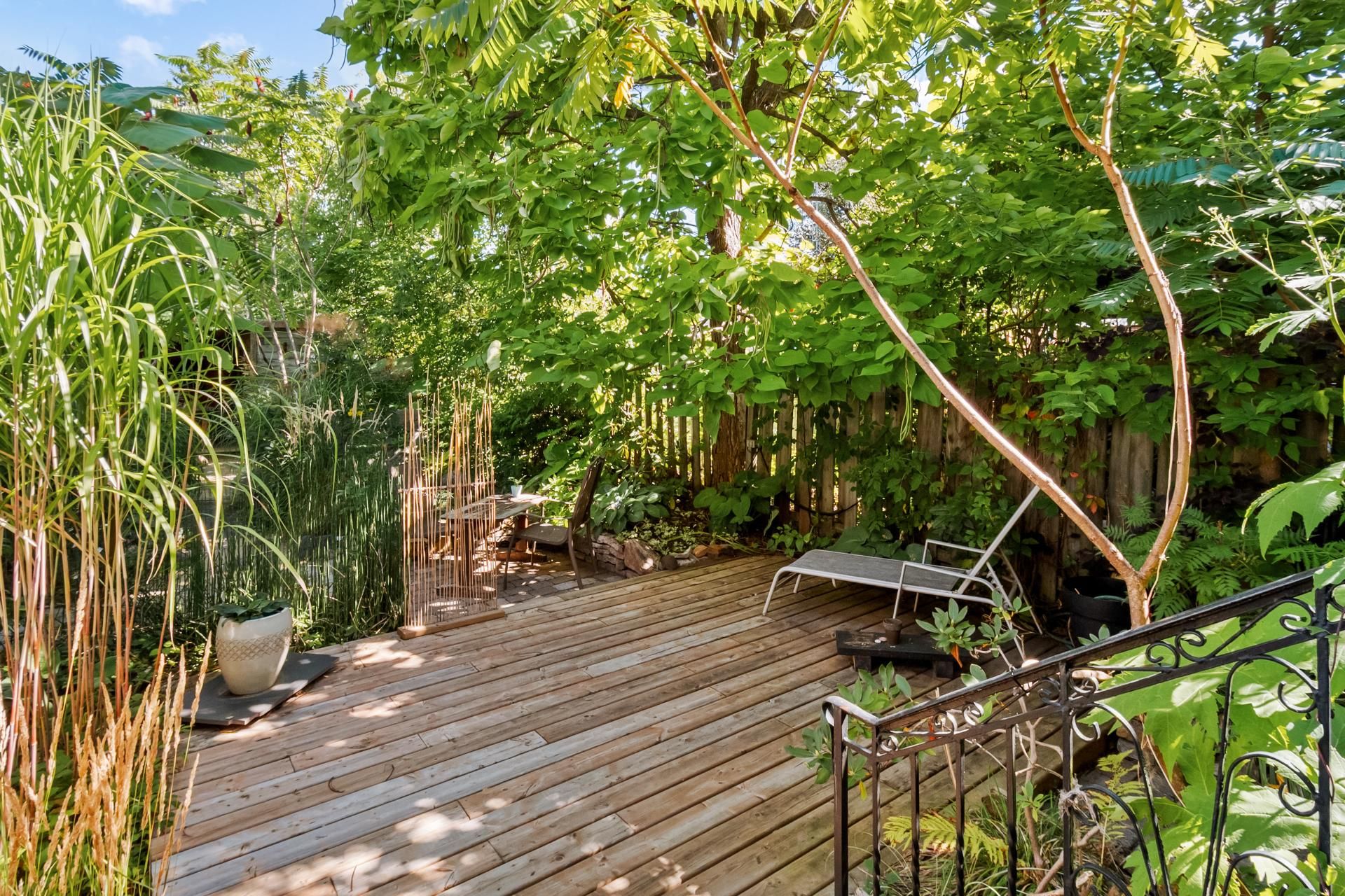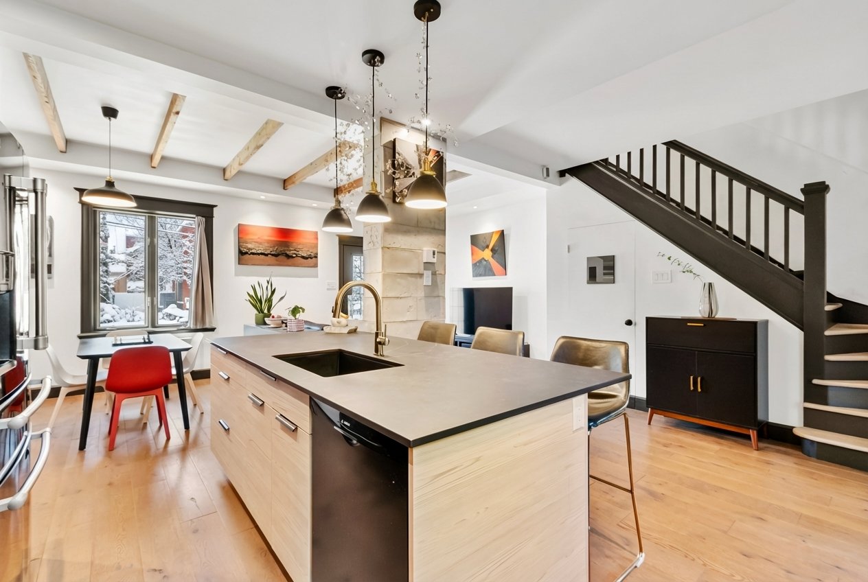 Charming property tastefully renovated with quality materials, combining character and modern comfort over 1,200 sq. ft. Featuring 3 spacious bedrooms, a bright office, two bathrooms, a powder room, and inviting living areas with hardwood floors and exposed beams. Modern kitchen with large island, ample storage, and rare black high-end appliances. Bathroom with clawfoot tub. Private backyard with lush exotic landscaping, 4 wooden terraces and mature vegetation creating a unique zen ambiance, all within walking distance to shops and services of Old Longueuil.