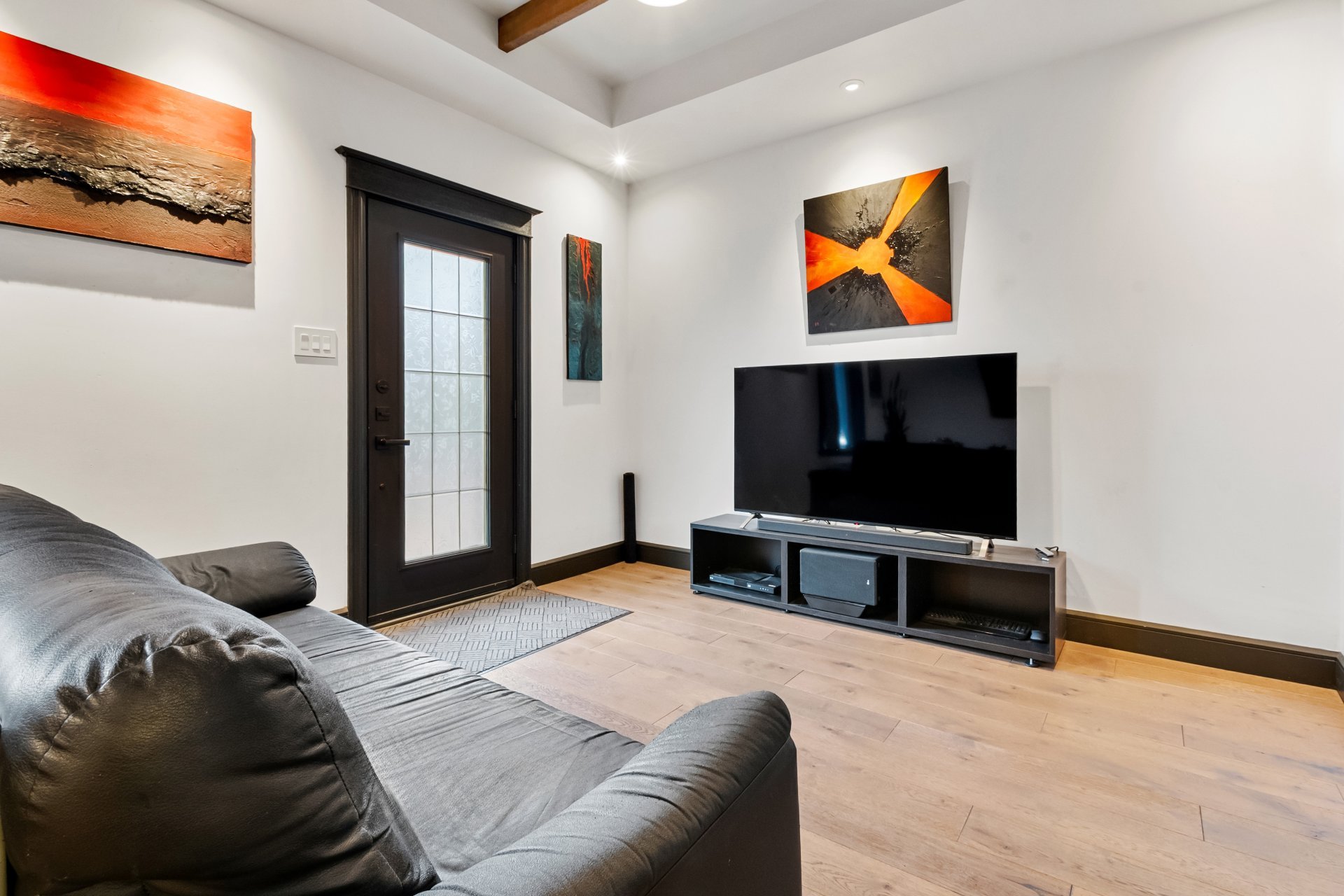 Natural wood floors and exposed beams enhance the home's