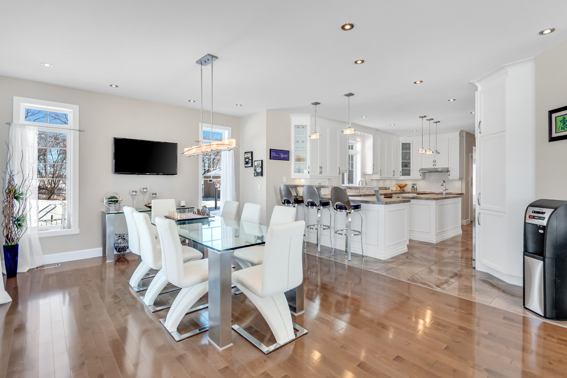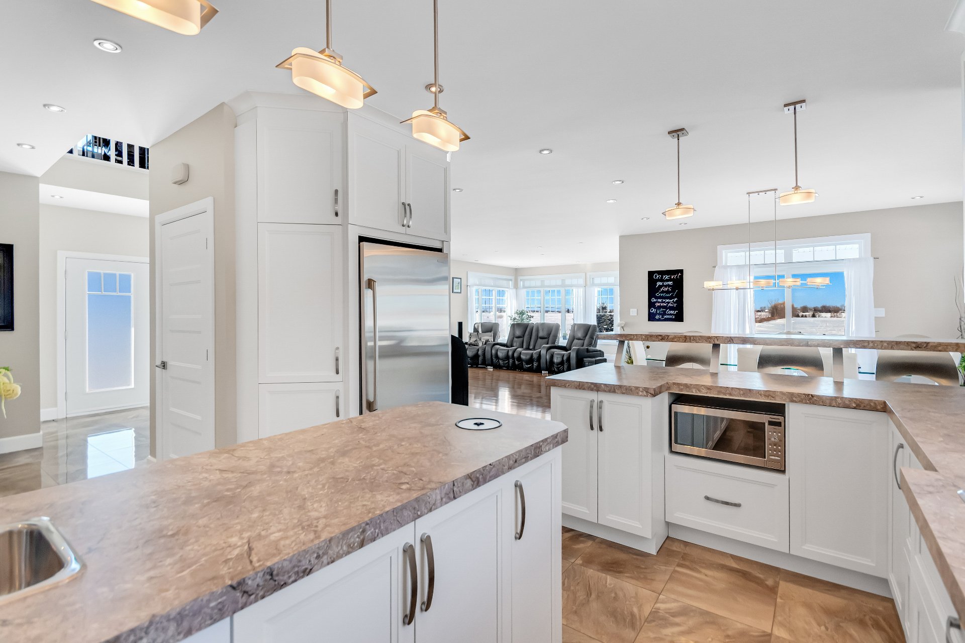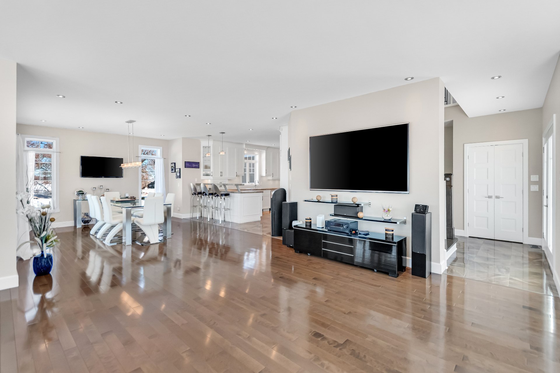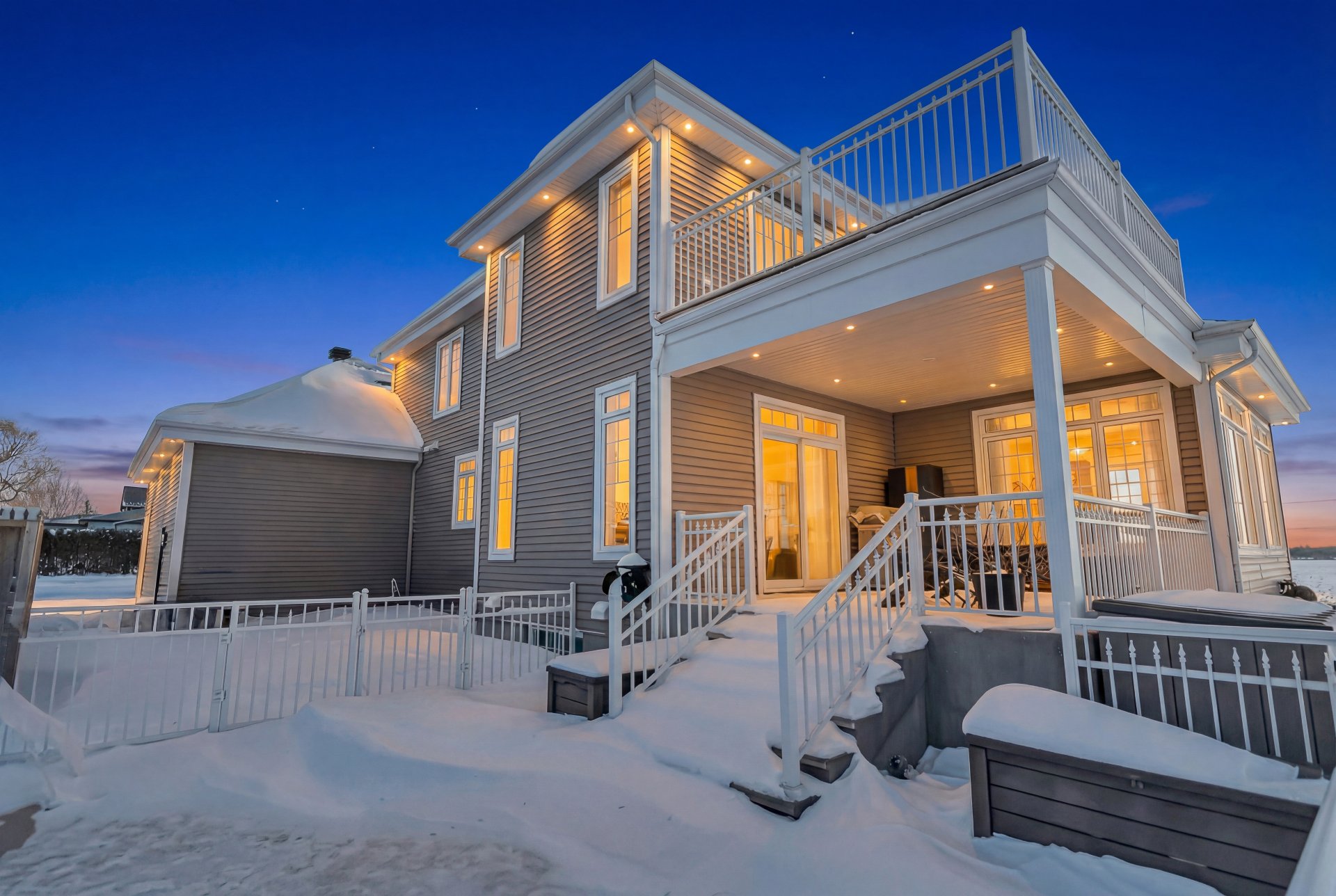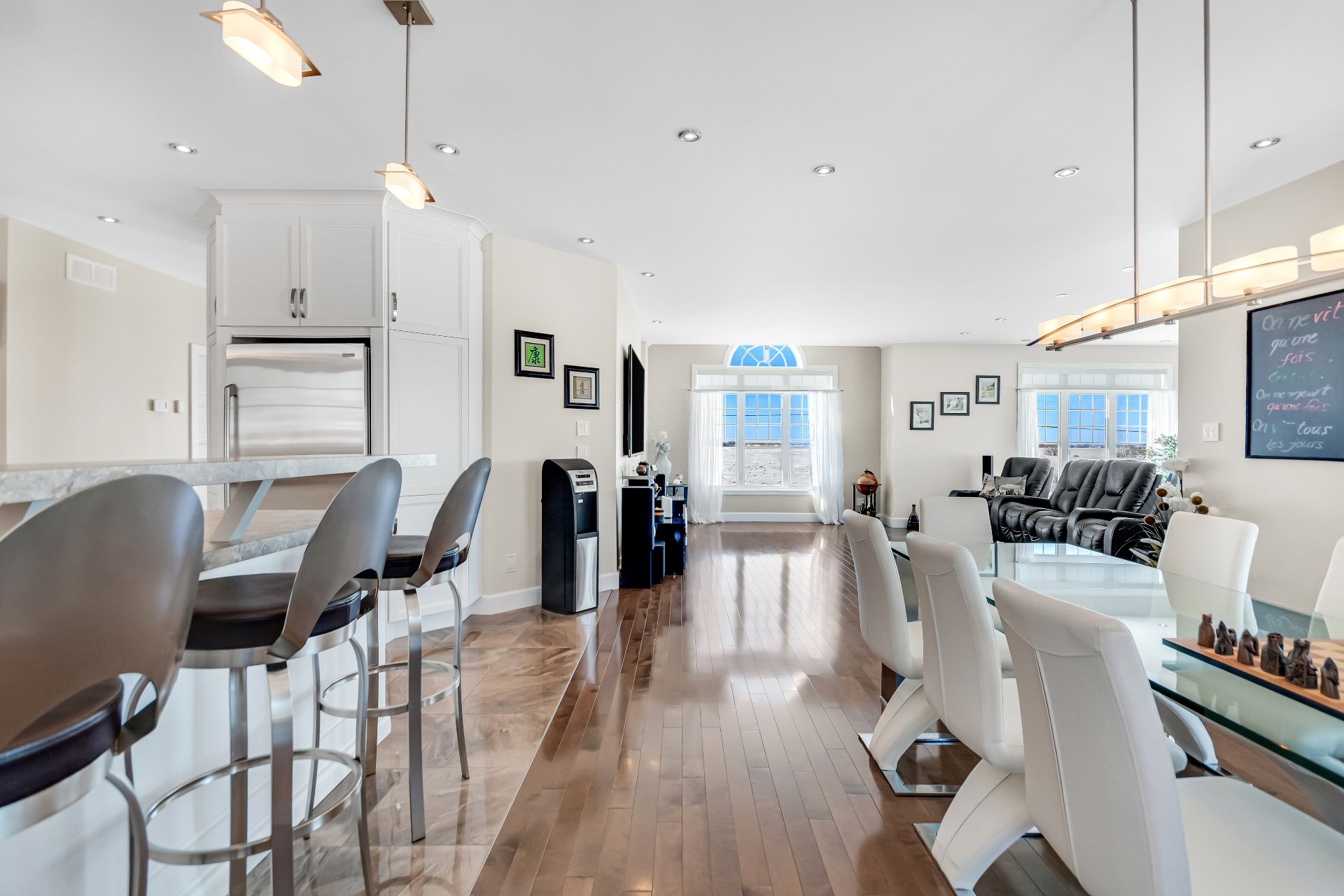 Inclus : luminaires, stores, rideaux et tringles, lave-vaisselle, réfrigérateur, cuisinière et hotte de cuisine, aspirateur centrale et accessoires, adoucisseur d'eau, ouvre porte de garage électrique, système d'alarme non relié, caméras extérieures, gicleurs, spa et accessoires de piscine