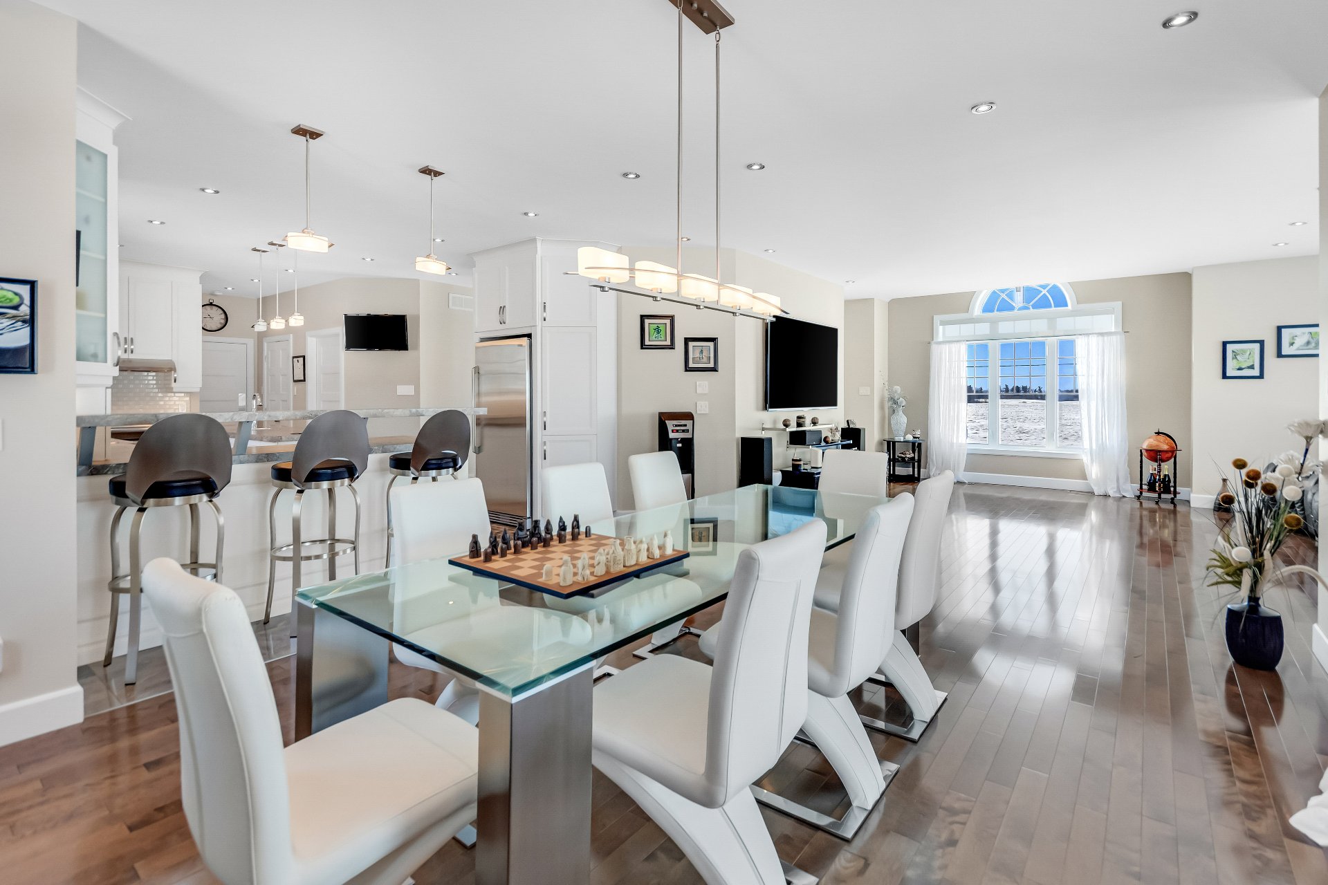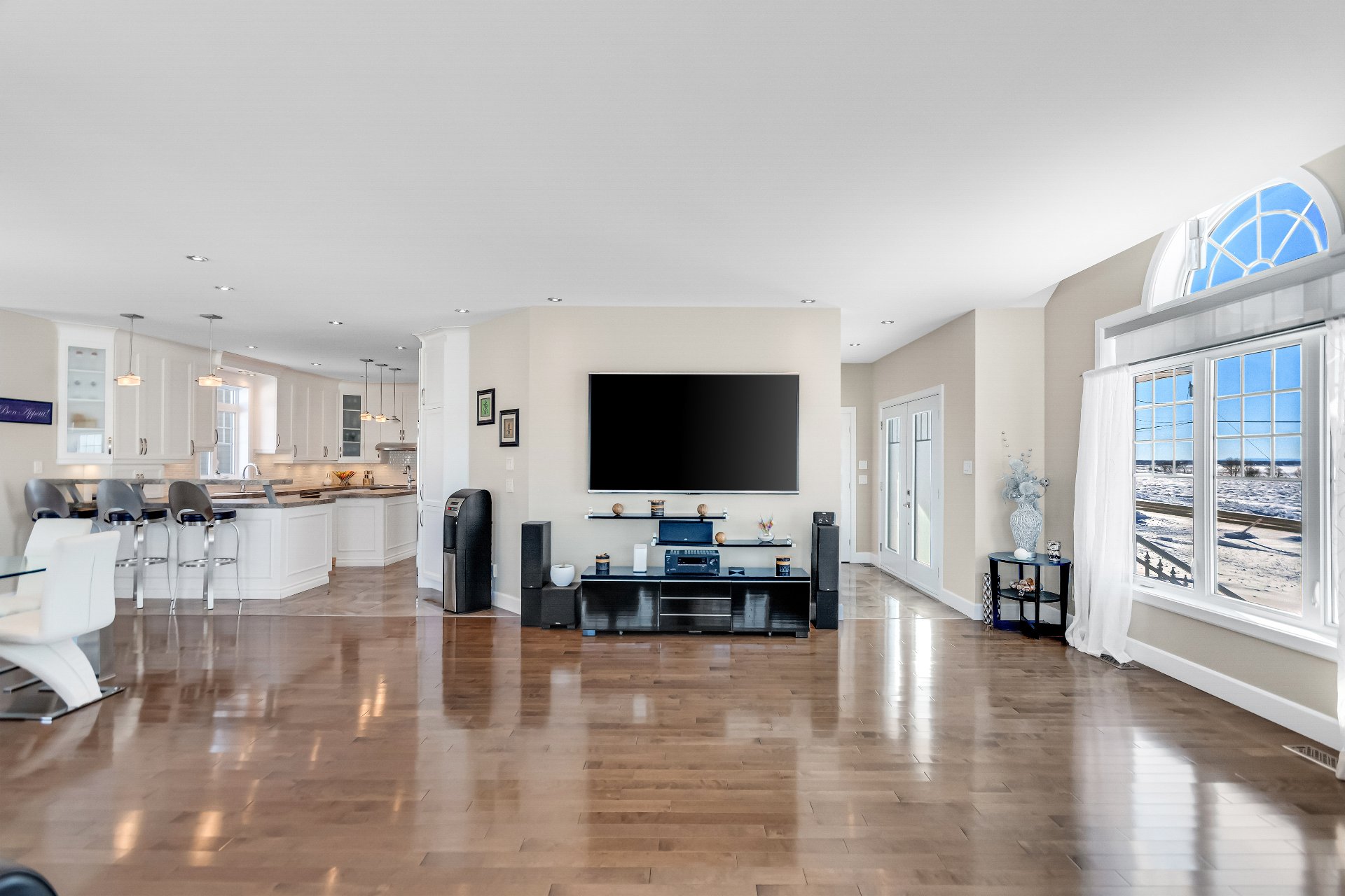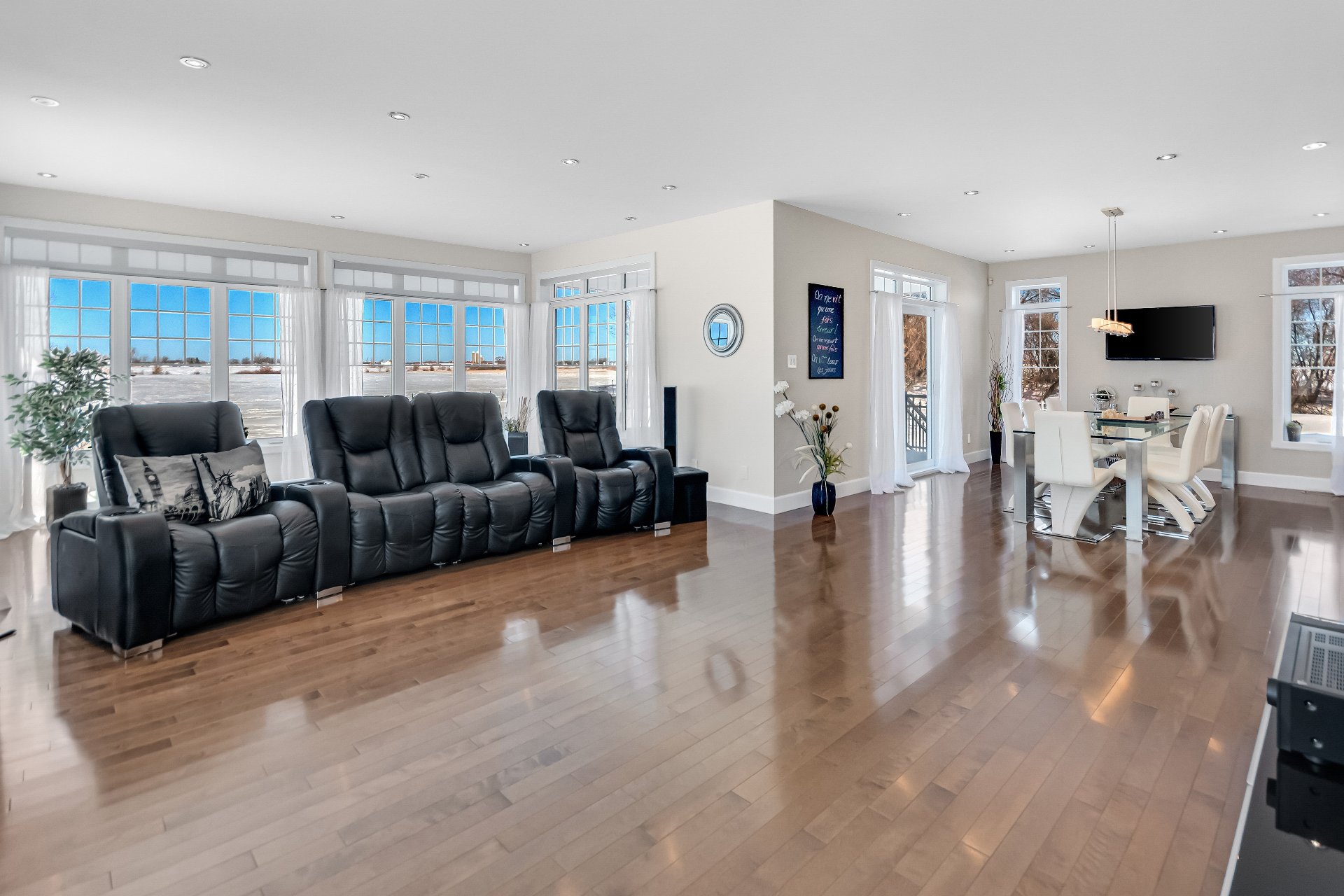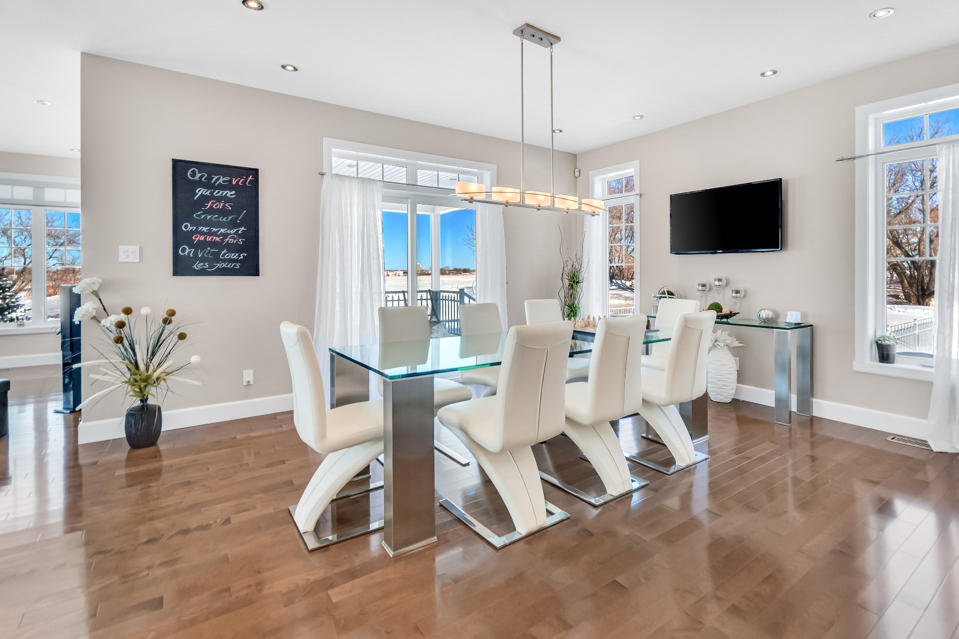 Inclus : luminaires, stores, rideaux et tringles, lave-vaisselle, réfrigérateur, cuisinière et hotte de cuisine, aspirateur centrale et accessoires, adoucisseur d'eau, ouvre porte de garage électrique, système d'alarme non relié, caméras extérieures, gicleurs, spa et accessoires de piscine