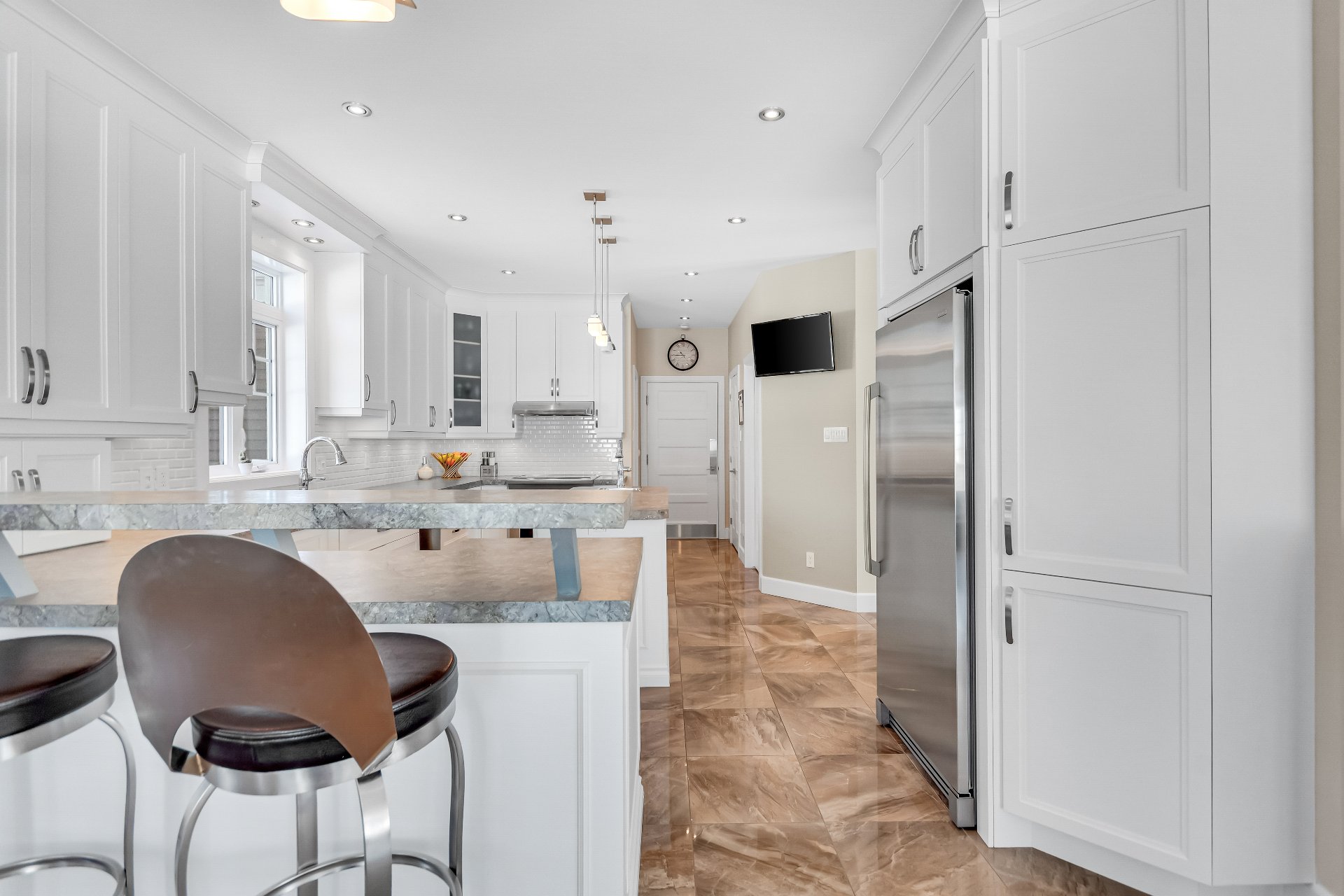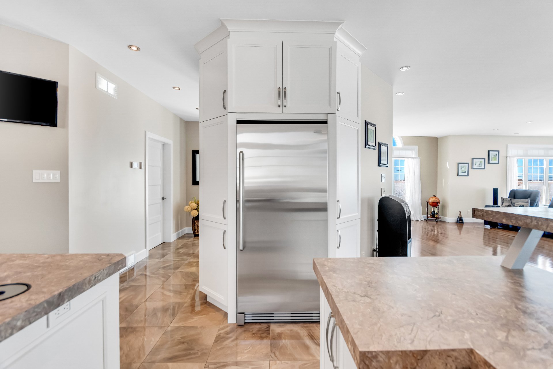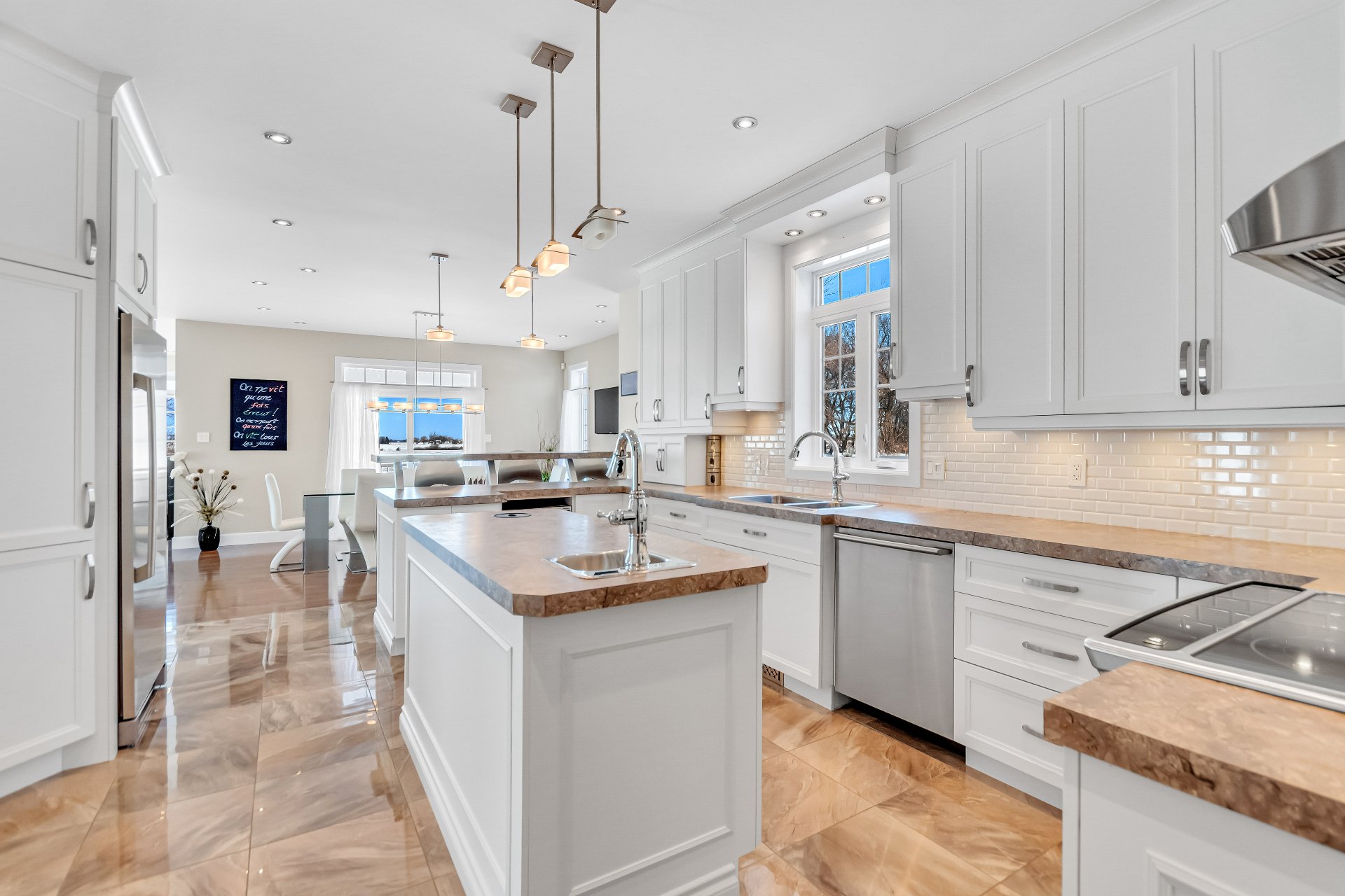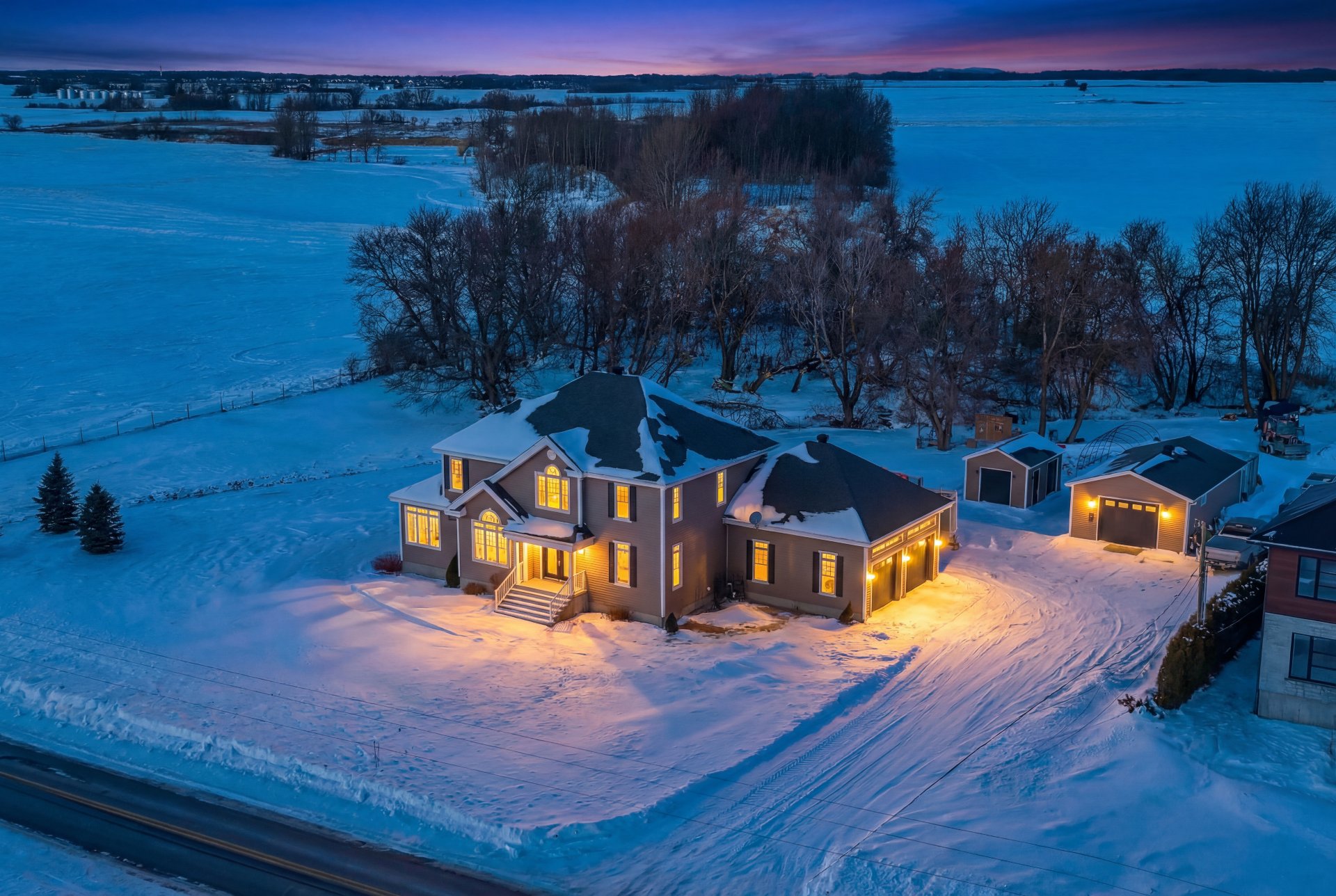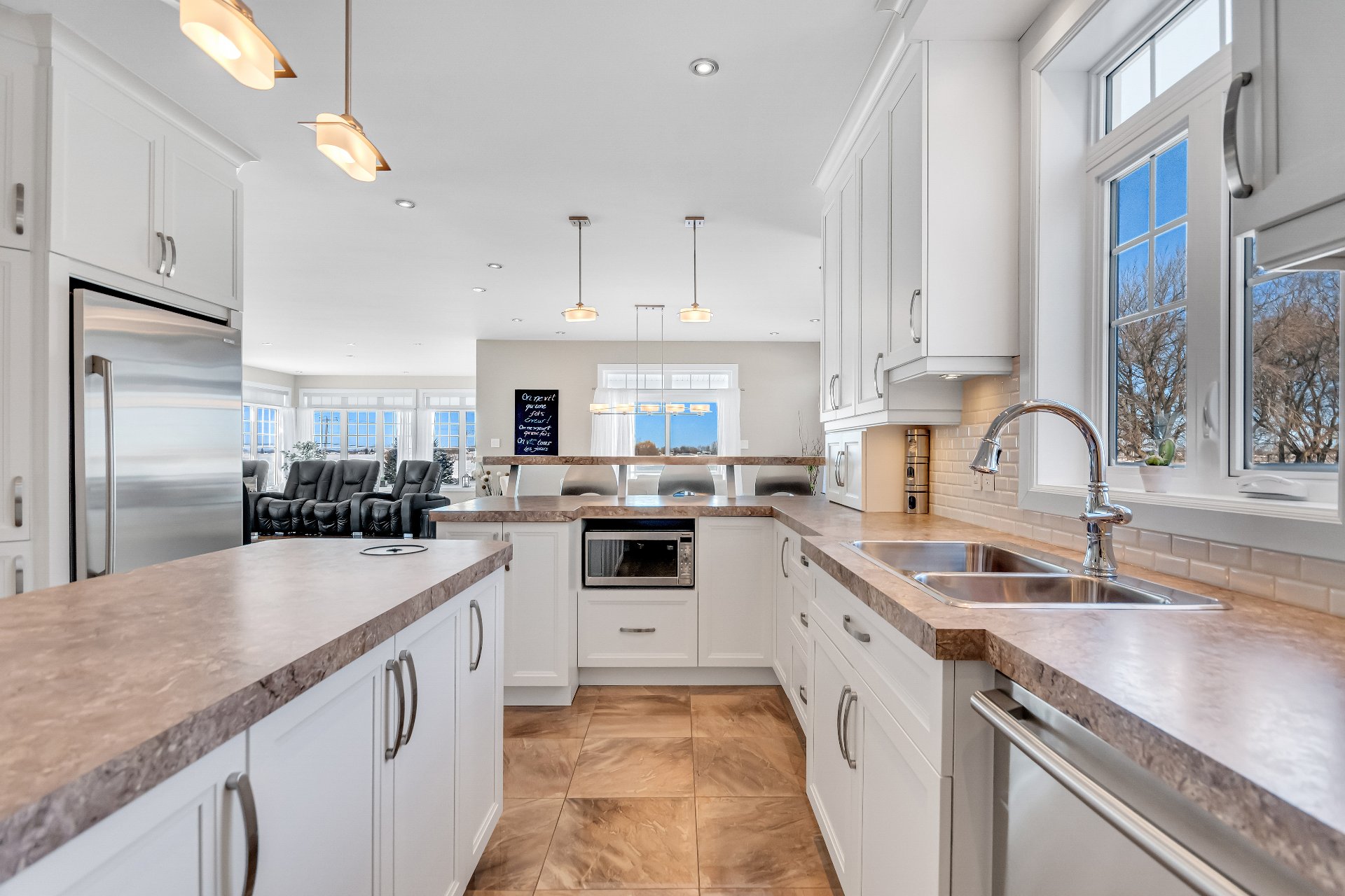 Inclus : luminaires, stores, rideaux et tringles, lave-vaisselle, réfrigérateur, cuisinière et hotte de cuisine, aspirateur centrale et accessoires, adoucisseur d'eau, ouvre porte de garage électrique, système d'alarme non relié, caméras extérieures, gicleurs, spa et accessoires de piscine
